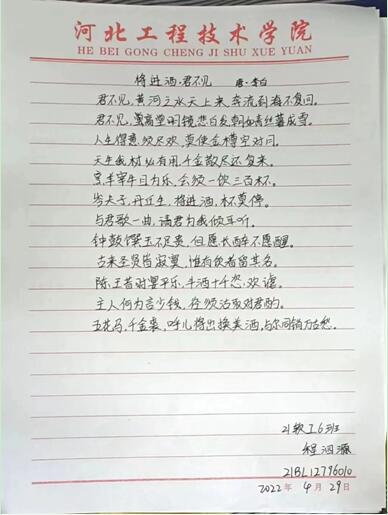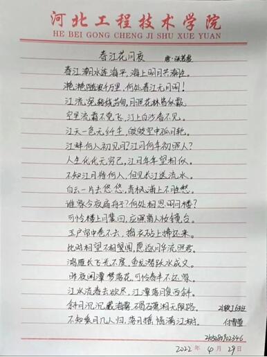 为了丰富同学们的校园文化生活,营造浓厚的古诗文学习氛围。进一步落实新课程标准中关于弘扬民族文化精髓的政策,增加员工经典文化底蕴。特此,球王会官网球王会于2022年4月29日晚自习开展“经典古诗文”抄写活动。