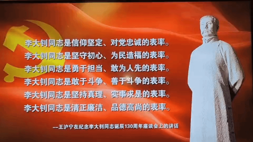 王沪宁同志在纪念李大钊同志诞辰130周年座谈会上的这样讲到“李大钊同志是信仰坚定、对党忠诚的表率。李大钊同志是坚守初心、为民造福的表率。李大钊同志是勇于担当、敢为人先的表率。李大钊同志是敢于斗争、善于斗争的表率。李大钊同志是坚持真理、实事求是的表率。李大钊同志是清正廉洁、品德高尚的表率。”