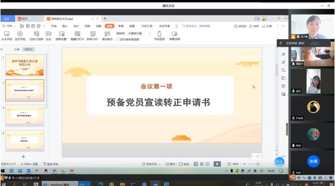 会议第一项是预备党员孟洁同志宣读转正申请书,汇报自己在预备期间的表现,总结了自己在工作、学习上以及生活上的进步和不足,最后表达了自己对加入中国共产党的坚定决心和信念。