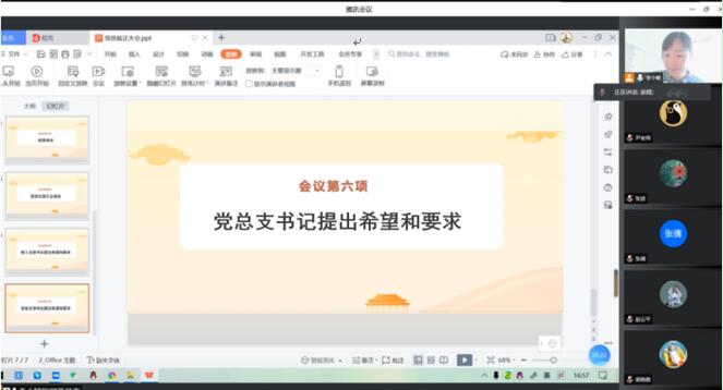 会议第六项是党总支书记王亚杰同志提出两点希望和要求,第一点:政治追求方面,他指出无论是新党员还是老党员,我们加入了中国共产党,那么我们的起点和人生追求就会比其他人高,我们申请入党,成为一名共产党员绝不是为了充门面或者为了一张党票,我们的入党动机很坚定,我们的政治觉悟很高,我们应该把自己的人生追求融入到日常工作中去,融入到社会主流中去,我们应该牢记自己的党员身份,时刻以一名共产党员的标准严格要求自己,做到思想觉悟和实际相结合,无论在工作还是学习中,都要发挥党员的先锋模范作用,尤其是现在公司闭环管理的政策下,每一名共产党员都应该以身作则,时时处处起先锋模范作用,同时也为我们公司的迎评工作做出自己应有的贡献;第二点,加强理论学习,提升党员综合素质。应该充分利用学习强国这一个平台,加强理论知识学习,功夫用到平时上,每天都应该学习积累。