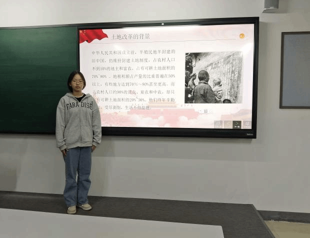 2022级网络空间安全二班的李智慧同学、软件工程一班的耿子康同学以及软件工程三班的李昊泽同学主要介绍了土地改革的意义。轰轰烈烈的土地改革运动,猛烈冲击着几千年来的封建土地制度。土地改革的完成,标志着在我国延续两千多年的封建制度的基础——地主阶级的土地所有制至此彻底消灭了,打碎了几千年来套在农民身上的封建枷锁,农民真正成为土地的主人,它从根本上解放了农村生产力。这一翻天覆地的变化,使亿万农民在政治上、经济上获得了解放。为新中国的工业化开辟了道路。