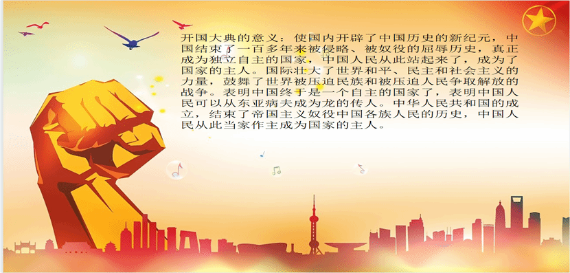 1949年10月1日,是中国共产党领导中国人民英勇奋斗,通过流血牺牲换来的日子,是中国共产党率领中国人民继续前进开创新时代的日子。这一天,新中国诞生了,全中国人民欢欣鼓舞,共同庆祝属于自己的盛大节日。那一刻是所有中国人民永远都无法忘怀的,我们终于不再弱小,我们是被世界认可的人。下面让我们走进四史教育专题第四十六讲——开国大典。