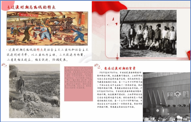 电子商务1班赵梓伊同学就党的过渡时期总路线提出的背景、特点、实质、时间、历史意义和历史局限性全方位总体解读了党的过渡时期总路线;软件工程5班李涵予同学详细讲解了党的过渡时期的总路线的历史依据。过渡时期总路线是根据马克思列宁主义关于从资本主义到社会主义的过渡时期理论,依照中国的具体情况,来确定中国从新民主主义过渡到社会主义的路线、方法和步骤,这是一条社会主义建设和社会主义改造同时并举的道路,体现了社会主义工业化和社会主义改造的紧密结合,体现了解放生产力和发展生产力、变革生产关系和发展生产力的有机统一。