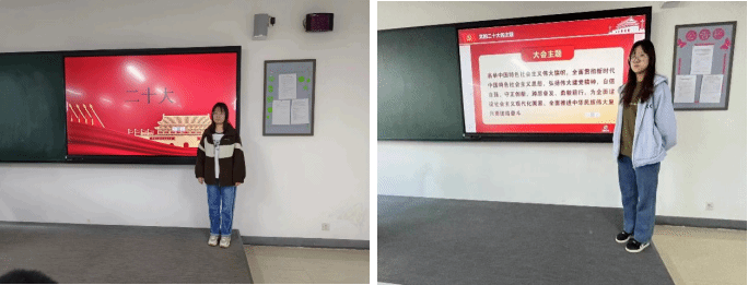 2022级电子商务二班的沈菲同学首先为同学们介绍了党的二十大精神,是全党、全军、全国各族人民团结一致,凝心聚力的思想源泉,是焕发热情、激发智慧、鼓舞斗志的法宝,是克服艰难险阻,无往不胜的武器。看当下,我们实现了第一个百年奋斗目标,距离实现第二个百年奋斗目标,从来没有比今天更近的时候;望未来,在党的二十大精神指引下,中国人民凭借聪明才智,以抓铁有痕,踏石留印的实干精神,梦圆中华民族伟大复兴可期,跻身强国之列、扬眉世界民族之林可待。
