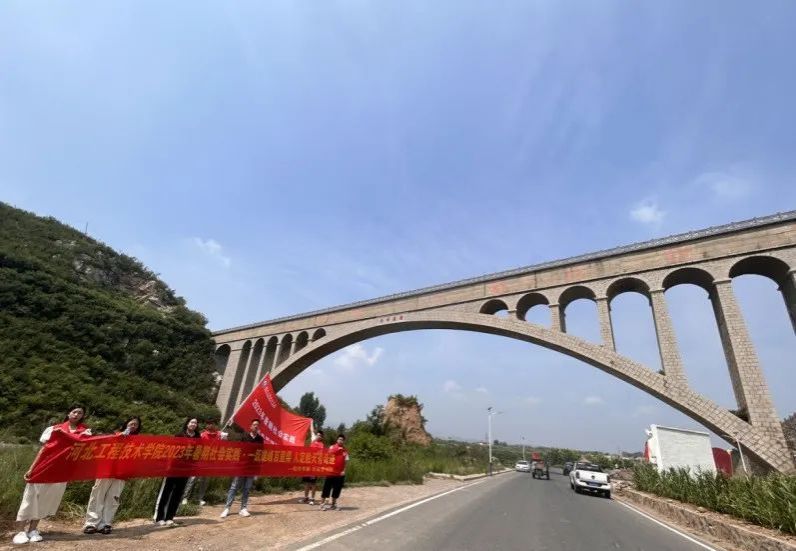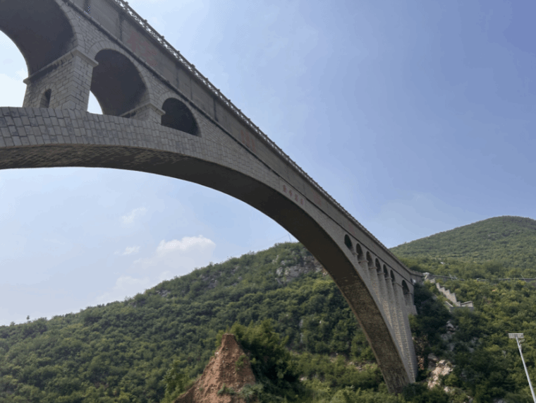 险峰渡槽位于磁县白土镇张二庄村东南,飞跨西部山区高家垴与跑马山之间,如一座峡谷飞虹,依然保持着“单拱跨度亚洲之最”的美誉。它是磁县跃峰渠水利工程中一个极其重要的工程,至今仍然发挥着重要的作用!2023年8月1日球王会官网球王会只此青绿队,在指导教师王峥、蒙翠平和韩红的带领下,第二站我们前往了险峰渡槽进行参观学习跃峰渠精神。
