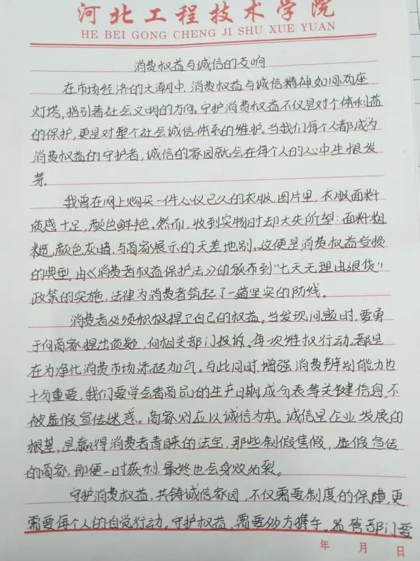 活动期间,同学们围绕主题,结合自身经历、社会现象等展开创作。有的同学分享了自己遭遇消费欺诈的经历,详细阐述如何运用法律武器维护自身权益,为其他同学提供了实用的维权经验;有的同学则从宏观角度探讨诚信在市场经济中的关键作用,呼吁大家共同营造诚信的消费环境。一篇篇征文主题鲜明、内容丰富,展现出同学们对消费权益和诚信问题的深刻理解。