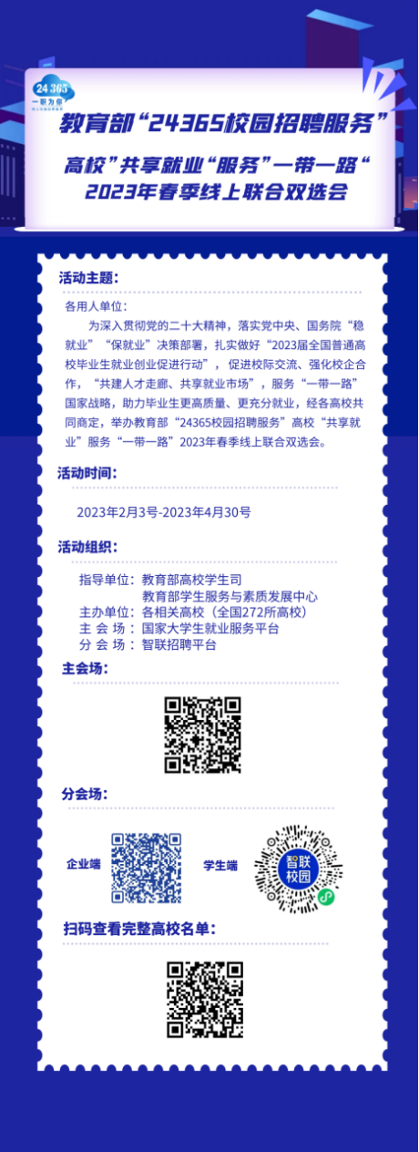 寒假促就业“暖心行动” 教育部“24365校园招聘服务”高校“共享就业”服务“一带一路”2023年春季线上联合双选会