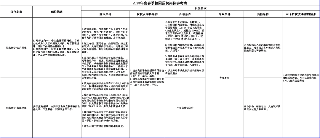 附件:中国工商银行河北分行2023年度春季校园招聘岗位参考表