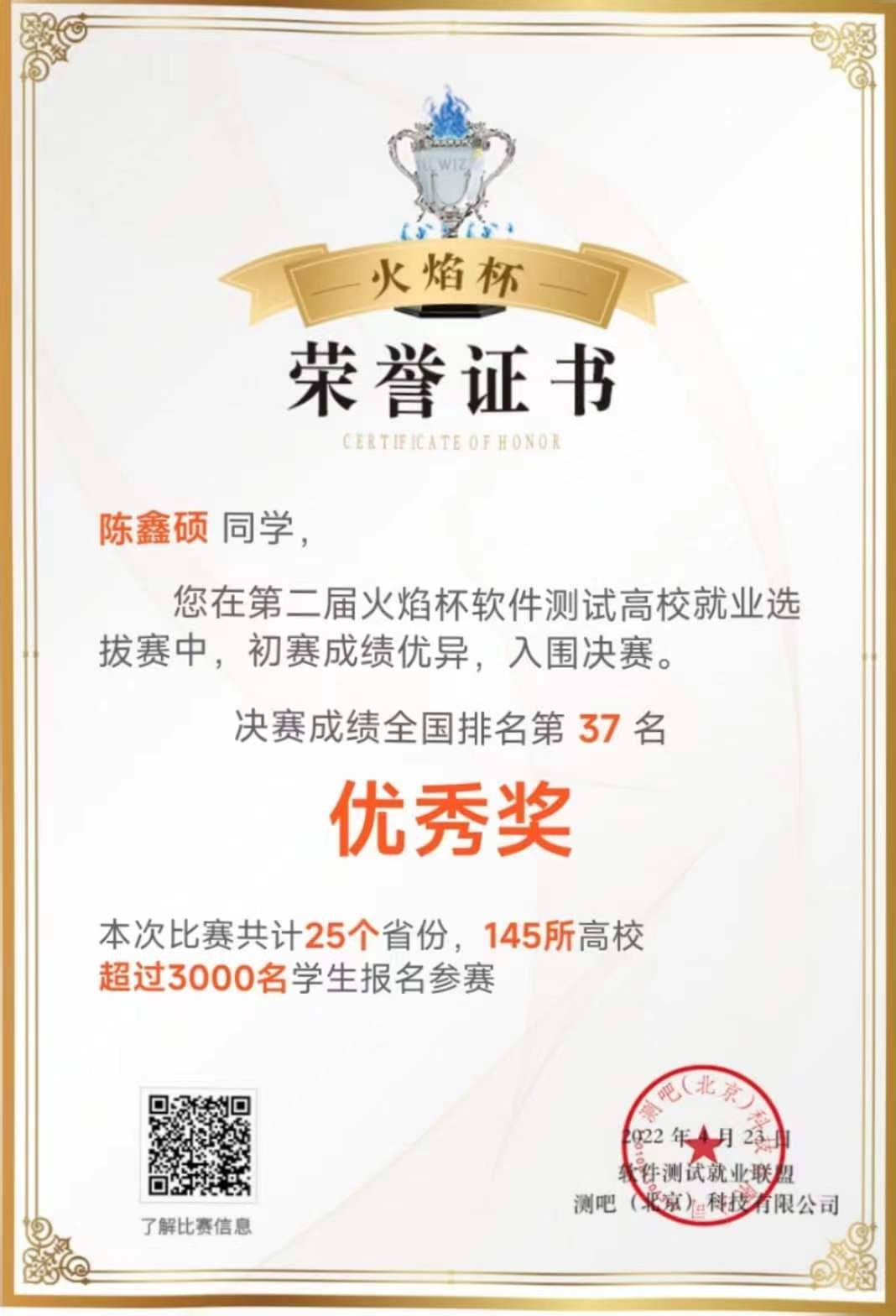 2022年4月获第二届全国火焰杯优秀奖