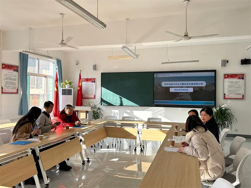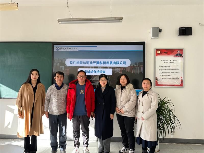 2024年1月3日上午,球王会经理赵冬梅、校企合作与社会服务部长王俊昆、实践教学中心主任刘平、网络空间安全系主任尹益燕与河北天翼科贸有限公司总经理原伟、综合部经理王文青举行校企合作洽谈会。