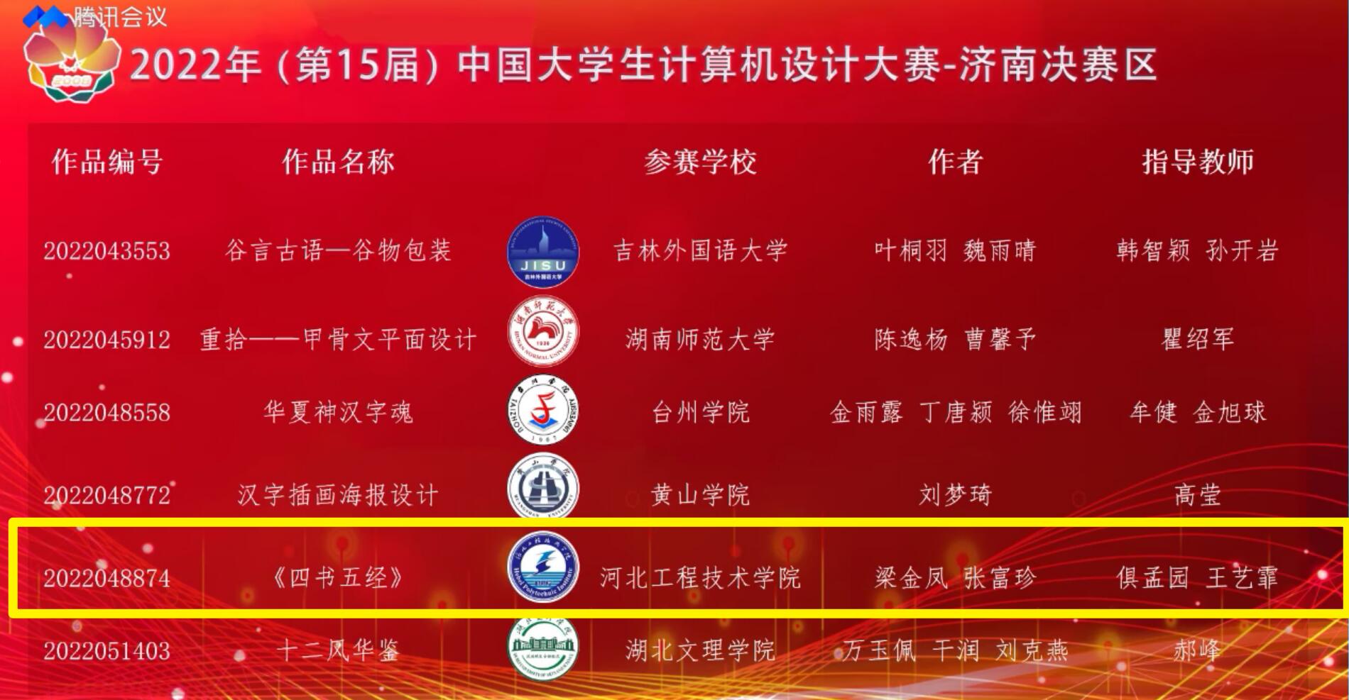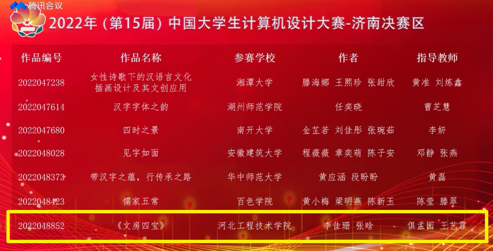 对于此次竞赛,公司高度重视。从校园选拔赛到省级比赛再到国家赛,公司员工在球王会俱孟园老师、王艺霏老师的专业指导下,参赛作品在大赛中取得了优异并且亮眼的表现。在国家赛中分别获得二等奖,三等奖。其中,梁金凤和张富珍的作品《四书五经》荣获2022年(第15届)中国老员工计算机设计大赛国赛二等奖,李佳珊、张晗的作品《文房四宝》荣获2022年(第15届)中国老员工计算机设计大赛国赛三等奖。